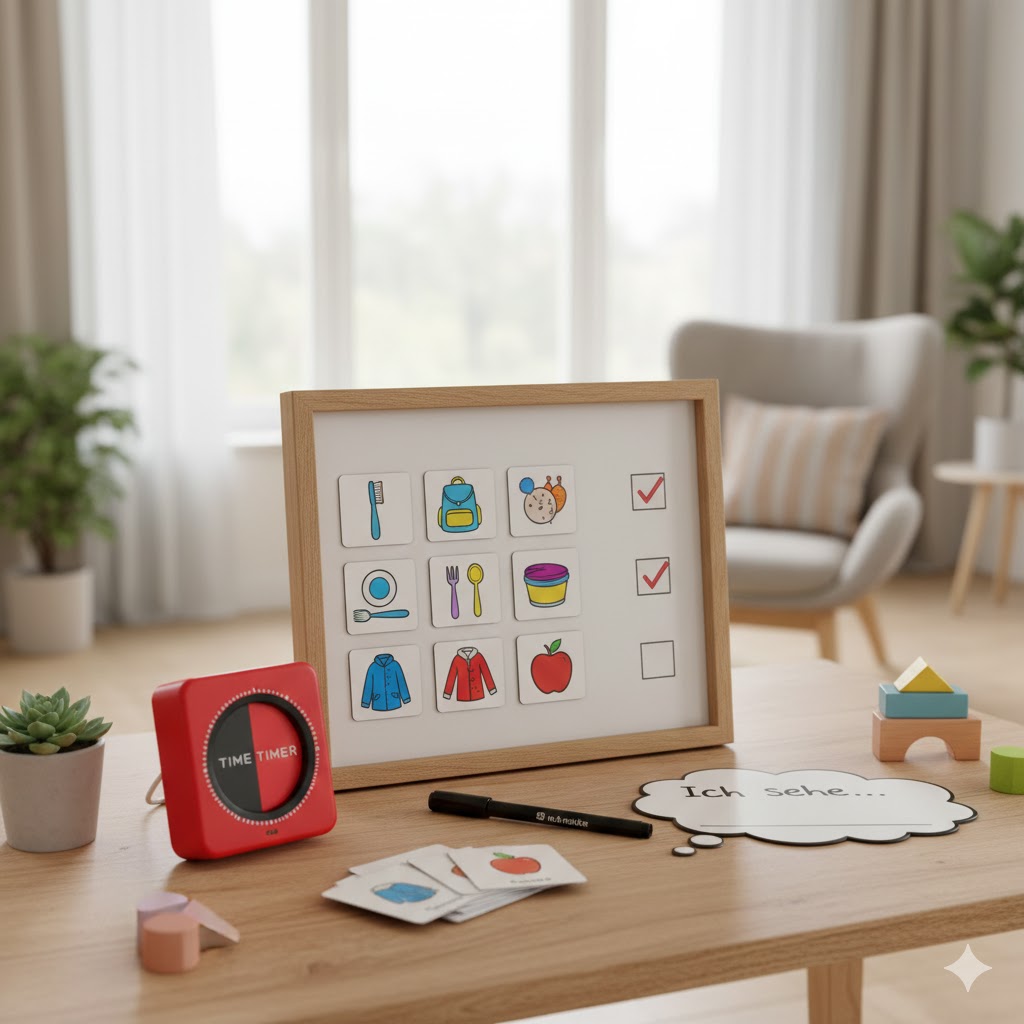 Visuelle Hilfen: Einsatz von Timern (z.B. Time Timer), visuellen Plänen und Sozialgeschichten zur Veranschaulichung von Abläufen.